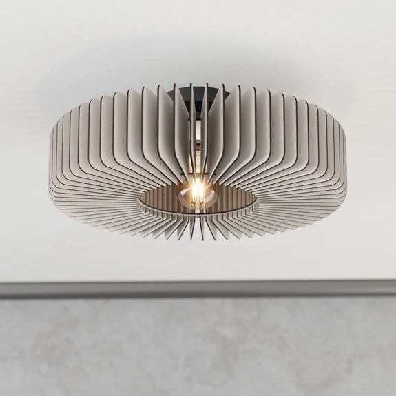 Die Deckenleuchte Palombaia besteht aus einem Gestell aus Stahl und rundherum daran angeordneten, dünnen Holzelementen mit lackierter Oberfläche. Diese lassen das abstrahlende Licht als effektvollen Strahlenkranz an der Decke erscheinen.