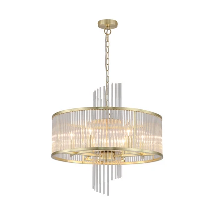 Die Hängelampe Lara vereint zeitlose Eleganz mit funktionaler Vielseitigkeit. Sie passt ausgezeichnet als Lichtspender über runde Tische und setzt stilvolle Akzente in jedem Wohn- oder Esszimmer. Die Kombination aus klaren und goldfarbenen Elementen verleiht der Lampe eine luxuriöse Ausstrahlung, die jeden Raum aufwertet.