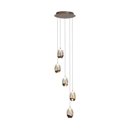 Die LED-Hängelampe Seeds mit fünf dekorativen Glasschirmen, die unterschiedlich hoch abgehängt sind, vereint stilvolles Design mit funktionaler Beleuchtung. Seeds passt ideal zu verschiedenen Raumkonzepten. Mit fünf Lichtquellen bietet sie eine gleichmäßige Ausleuchtung, die ideal für Wohn- und Esszimmer geeignet ist.