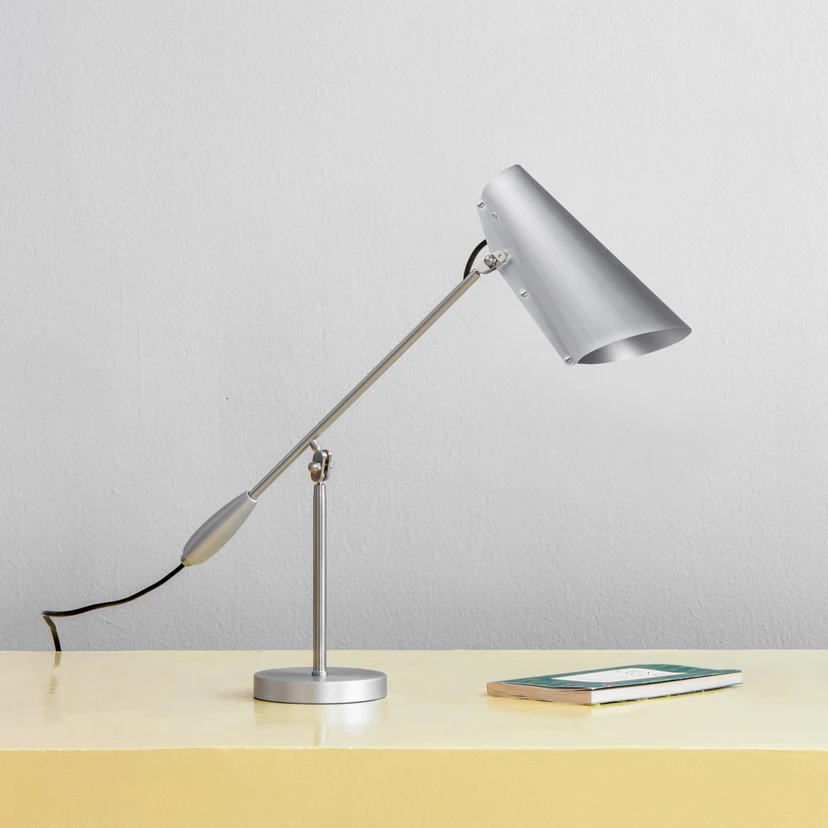 Birdys Geburtsstunde geht zurück in das Jahr 1952, als der norwegische Designer Birger Dahl (1916-1998) die Leuchtenserie Birdy schuf. Klare geometrische Formen ohne dekorative Details und Schnörkeleien sind Dahls Markenzeichen. Bei Birdy bedeutet dies, dass der Schirm aus einem schlichten Aluminiumkegel besteht und von einem schlanken Gestell mit zwei praktischen Gelenken gehalten wird. Verstellbar ist die Tischleuchte, die sich perfekt als Schreibtischleuchte eignet, einmal am Schirm und einmal in der Mitte des Gestänges.